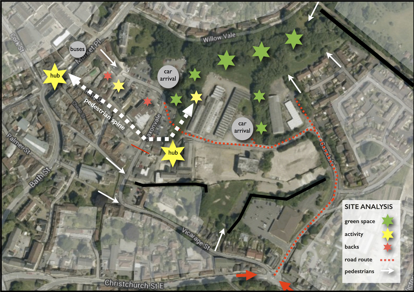We have also undertaken capacity studies and site analysis for the Saxonvale site in Frome, a 'modest masterplan' and urban extension to the town centre with riverside park & town squares.