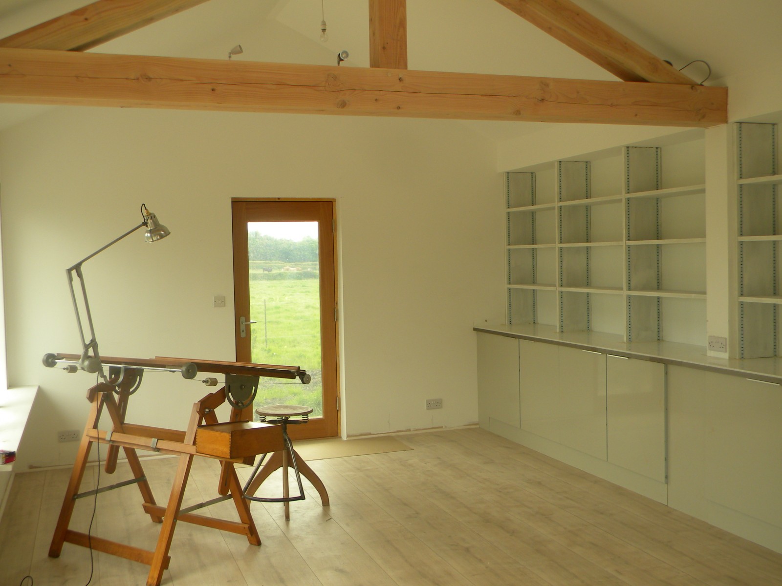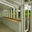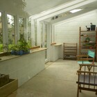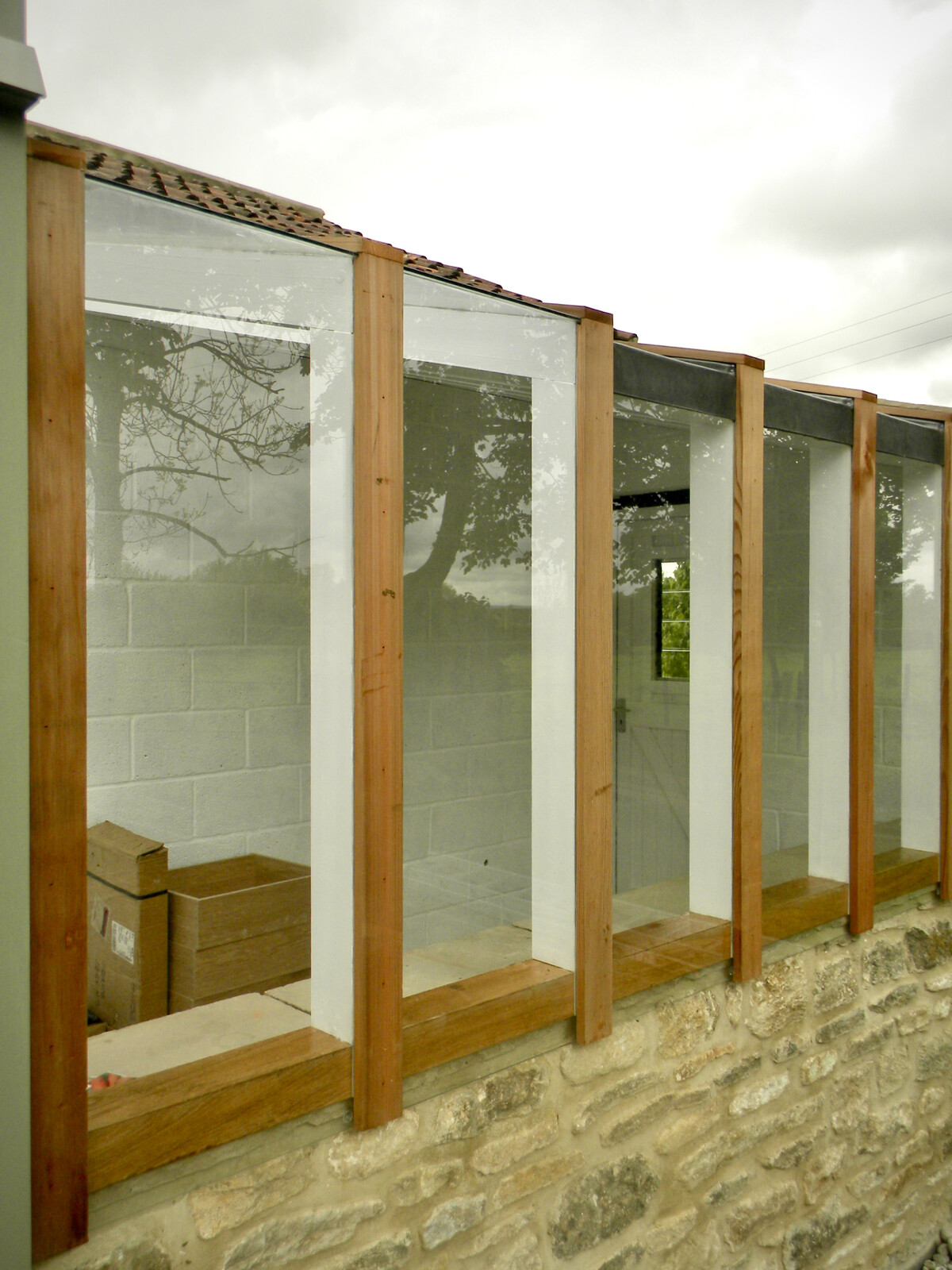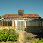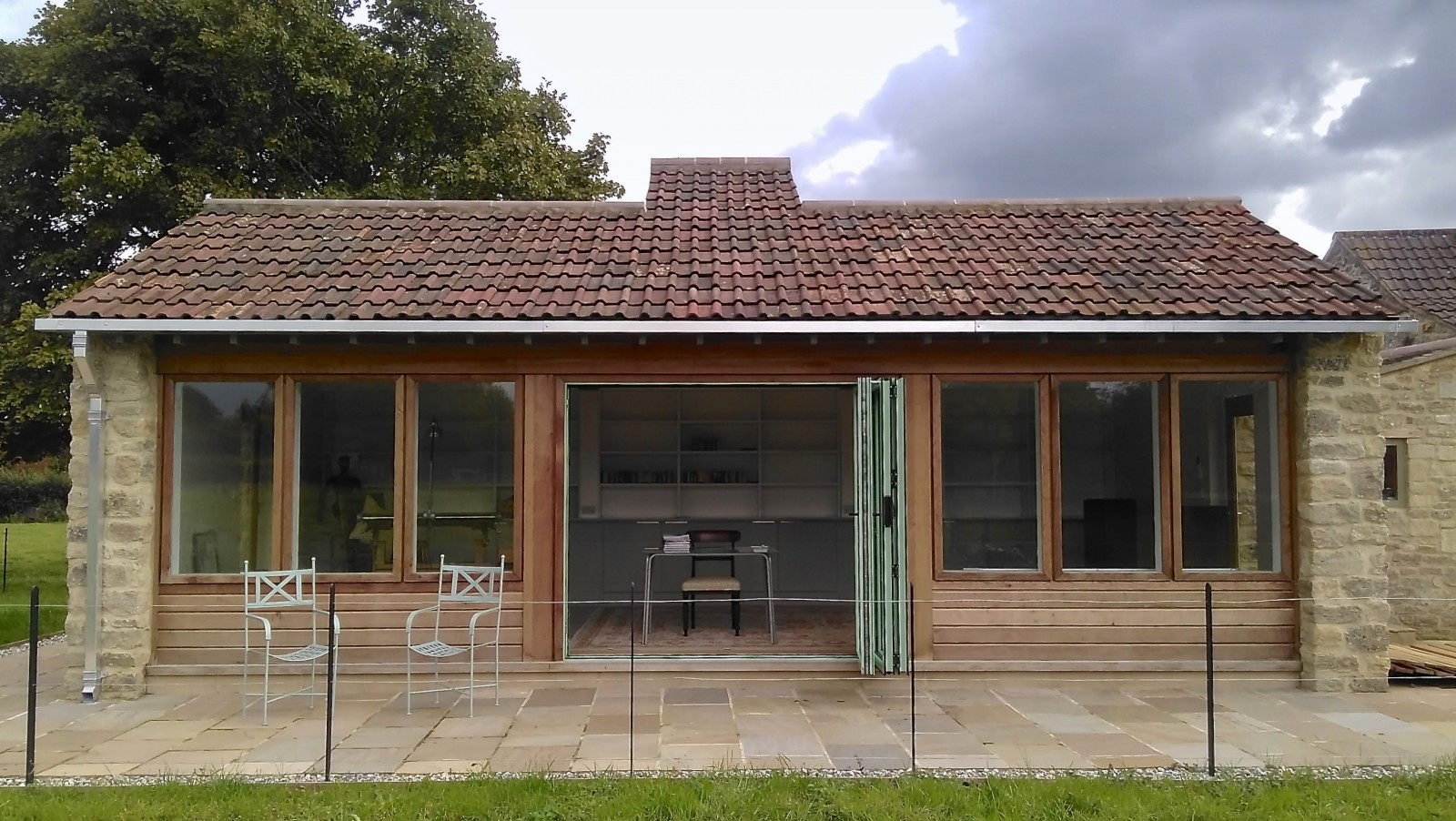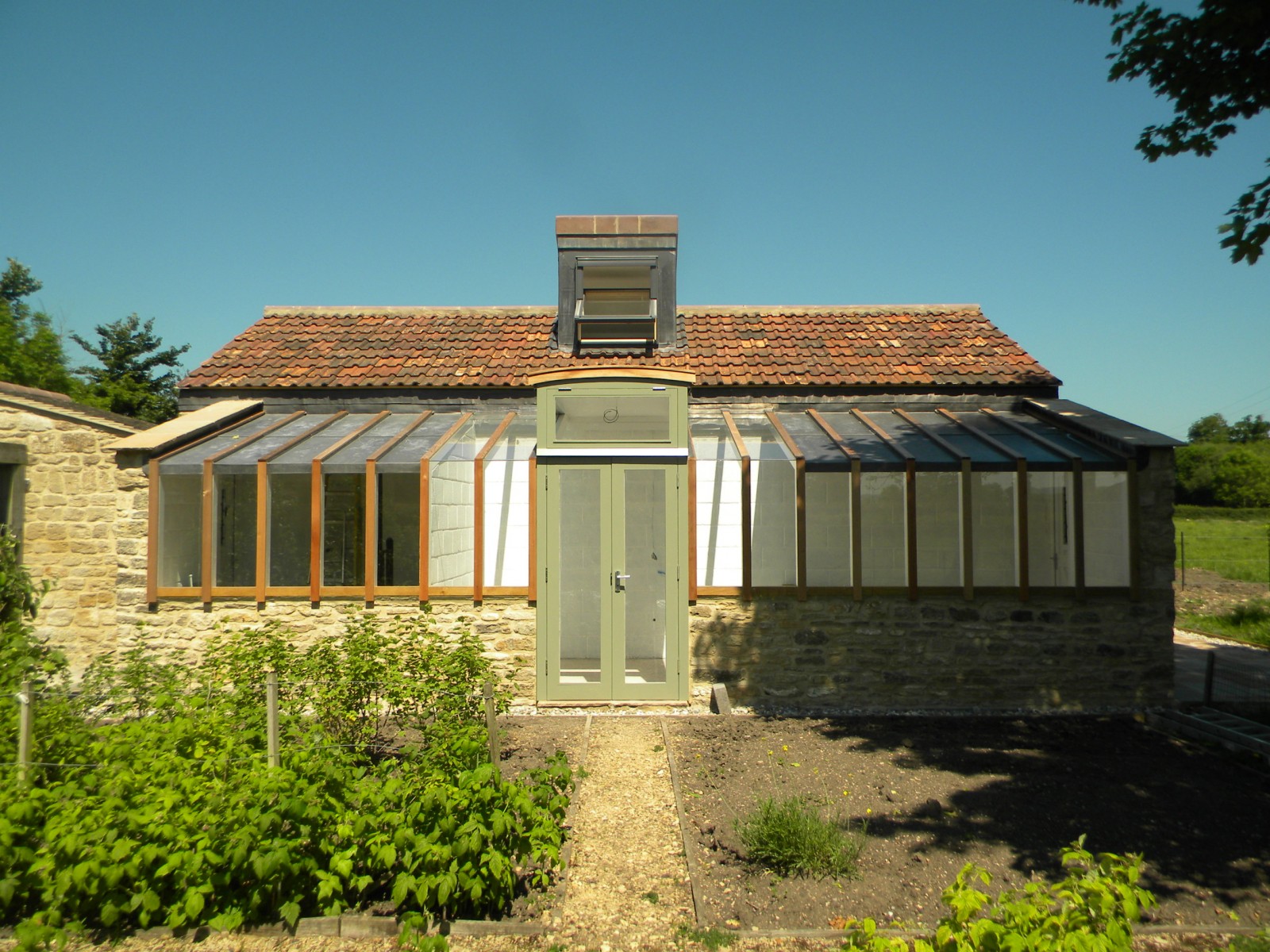 A 'Janus' garden building facing two ways, a different face and function for each of the owners, a music room for him to hold a collection of several thousand CDs, and a sunny gardening room and potting shed for her. The garden pavilion straddles an old stone wall, facing an existing formal potager to the south and open meadows to the north.