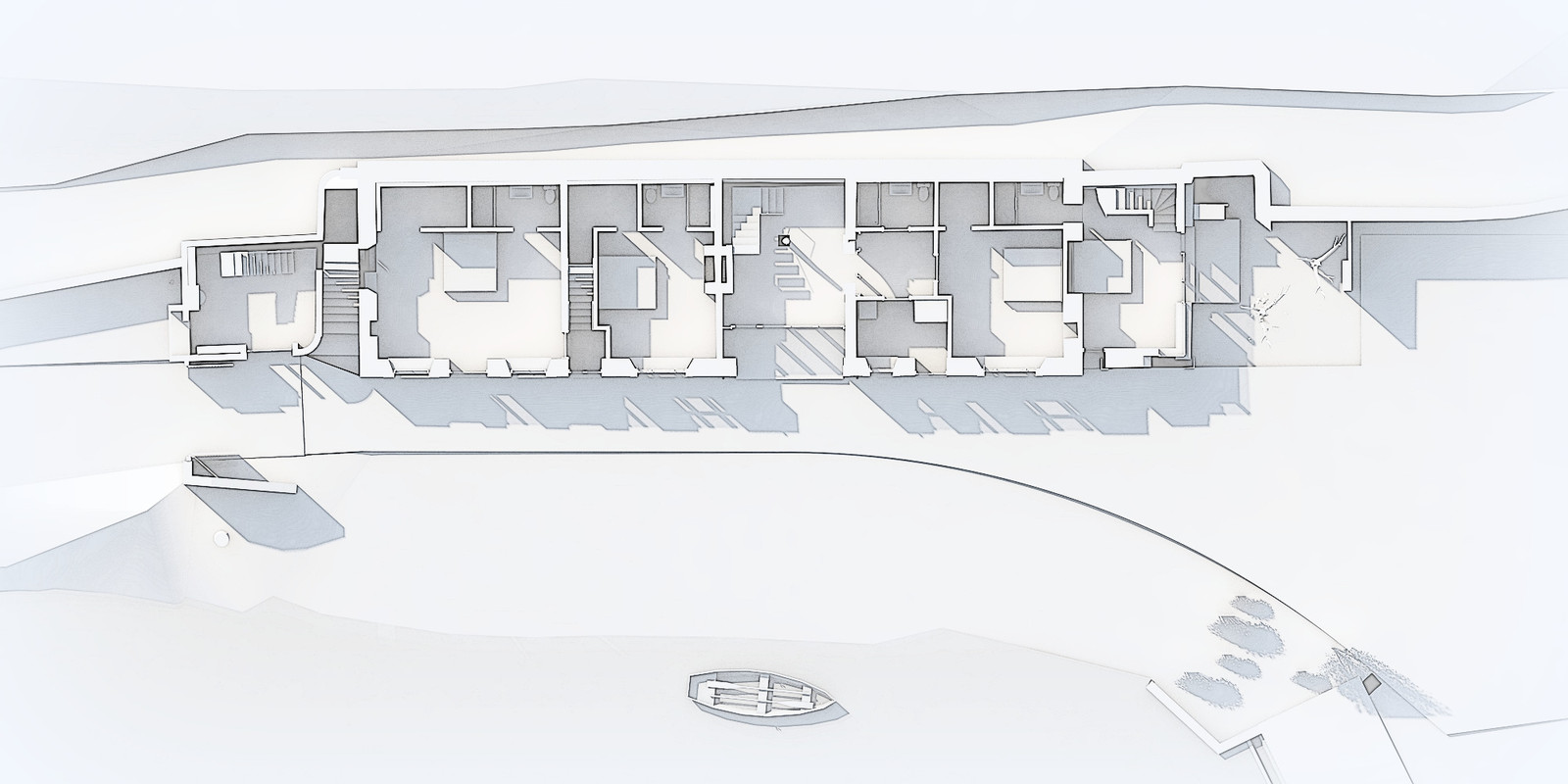 Our approach fully restores the main building, while treating flanking ruins 'as found', with contemporary extensions overlooking the river and approach. The house has an upside down arrangement of open plan first floor living spaces, making the most of the daylight and views in the steep sided wooded valley.