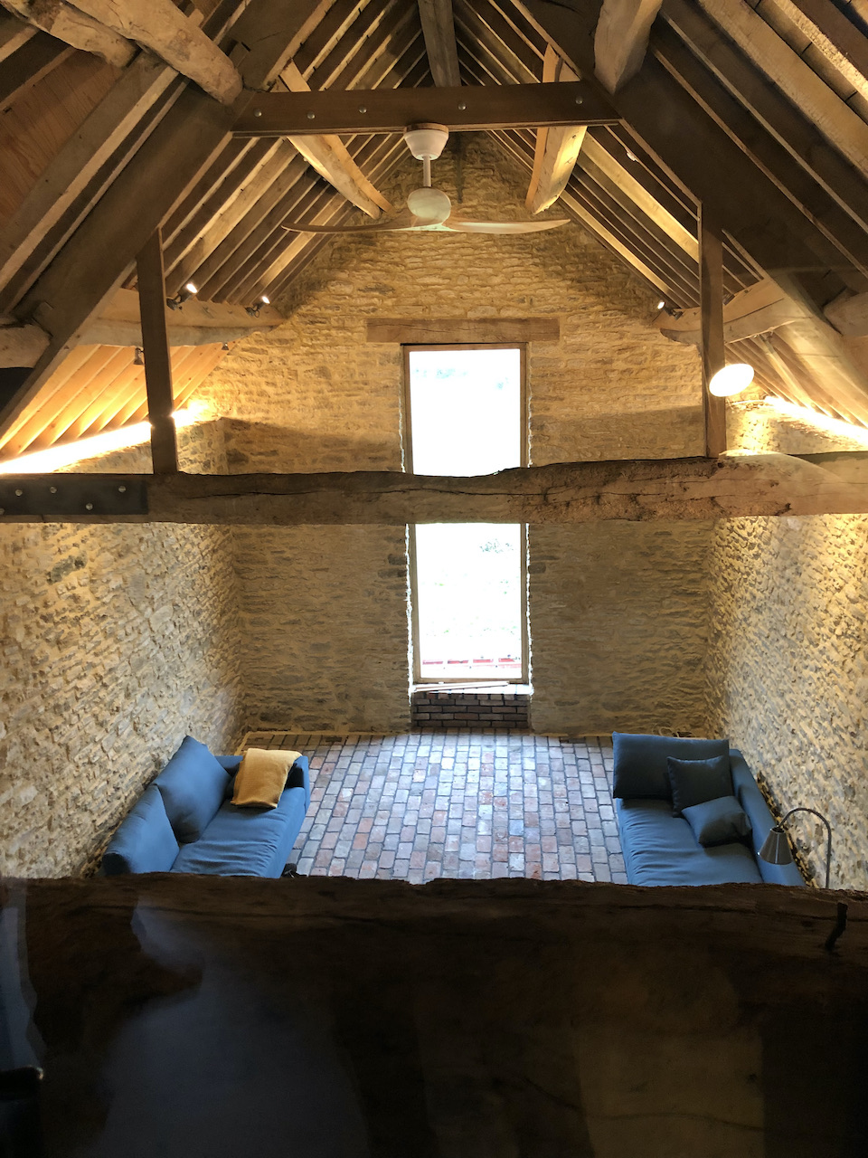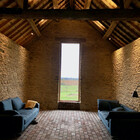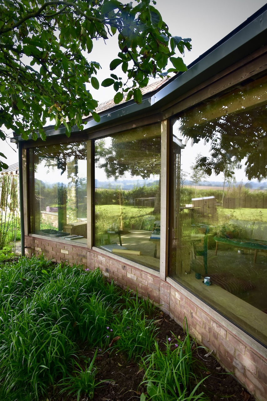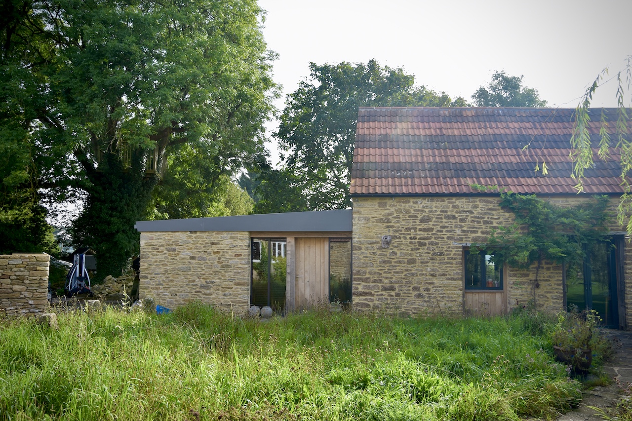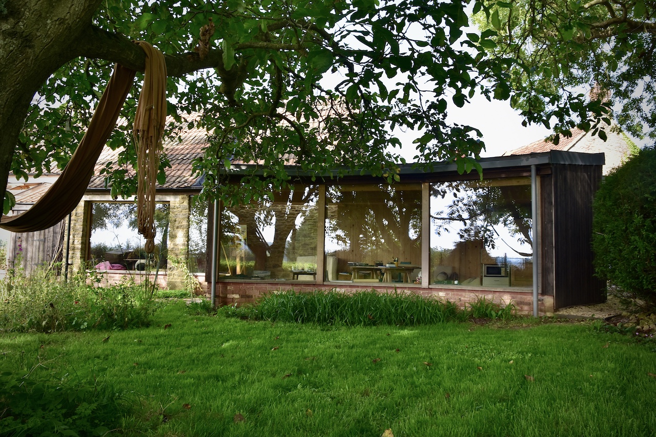 A collapsing barn and a dilapidated corrugated steel shed were the unpromising starting points for this conversion and extension to a self-contained garden annex for an artist. The site enjoys stunning views across hills to the Westbury White Horse. The artists studio extension was conceived as a curve to focus on a mature Walnut tree, without compromising the roots. The result is a cosy, super-insulated residence, with the beautifully renovated and repaired barn; a giant party space, complete with automated movie screen and minstrels gallery over.