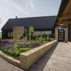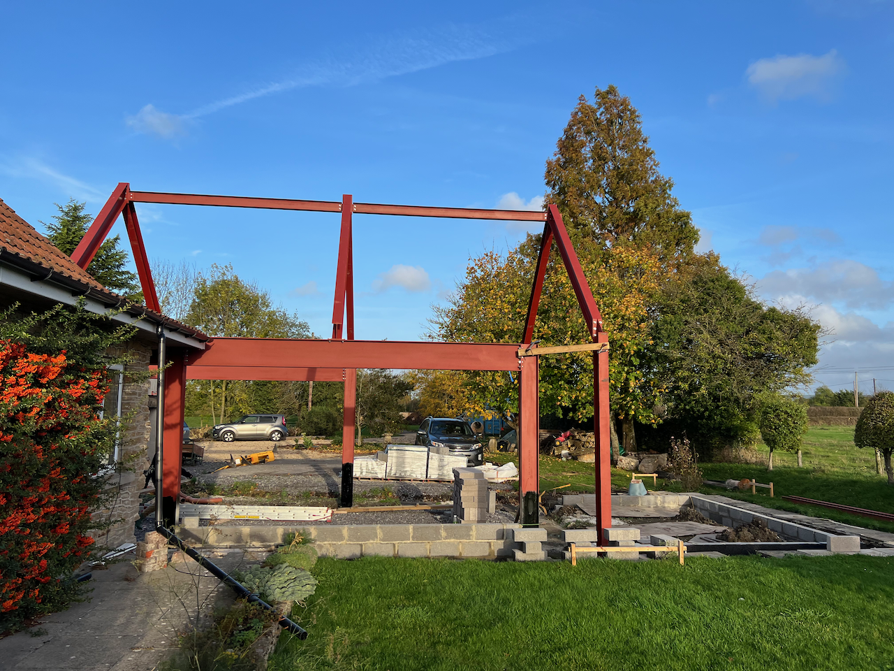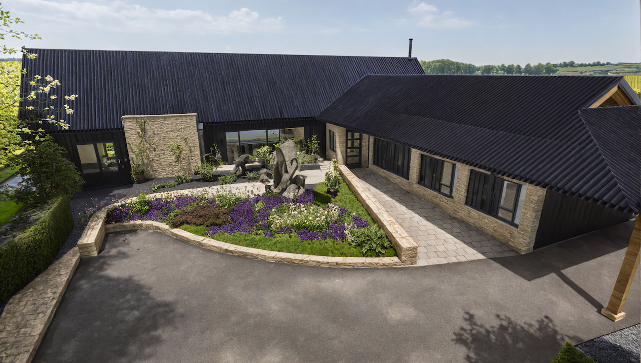 A new contemporary wing creates a welcoming covered entrance and forecourt. The extension accommodates a large open-plan family kitchen, dining room, play area, gallery, sitting room snug, with a first floor study over. It also connects to a highly renovated workshop and garage, converted to provide a guest wing. The entire project was built and managed by the owners, while living on site with their growing family, a triumph of their many skills!