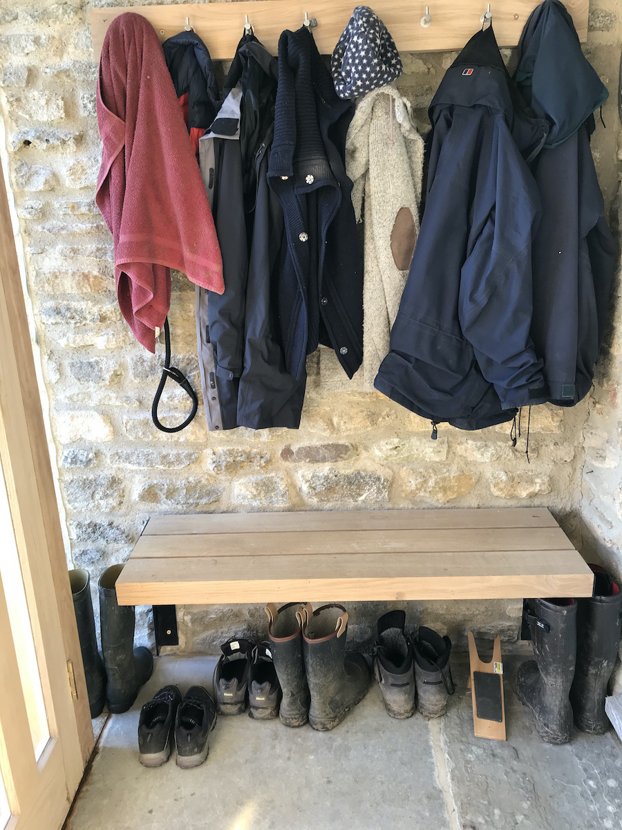 By introducing a simple flat roof and glass wall panels, the space was enclosed to make a lobby large enough to remove boots, with a fitted bench and coat hooks that minimised the clutter. The whole house benefitted from this little glass enclosure, especially the now comfortable and clutter free hallway!