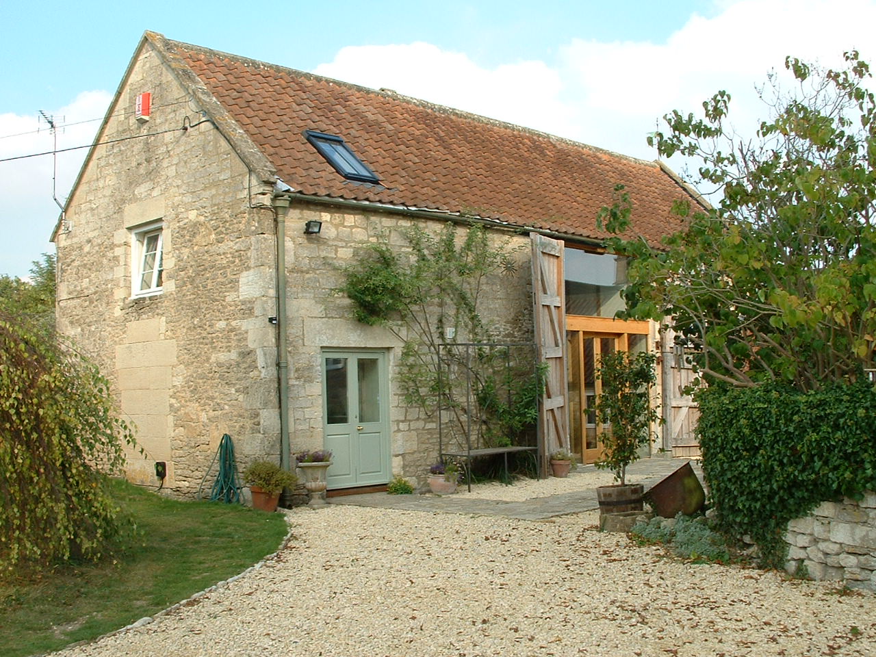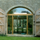Restoration of a milking parlour and barn to a guest suite and principal living area. Passive Solar heating with shading using the barn doors and recovered flagstones together with super-insulation gives comfortable year round occupation.