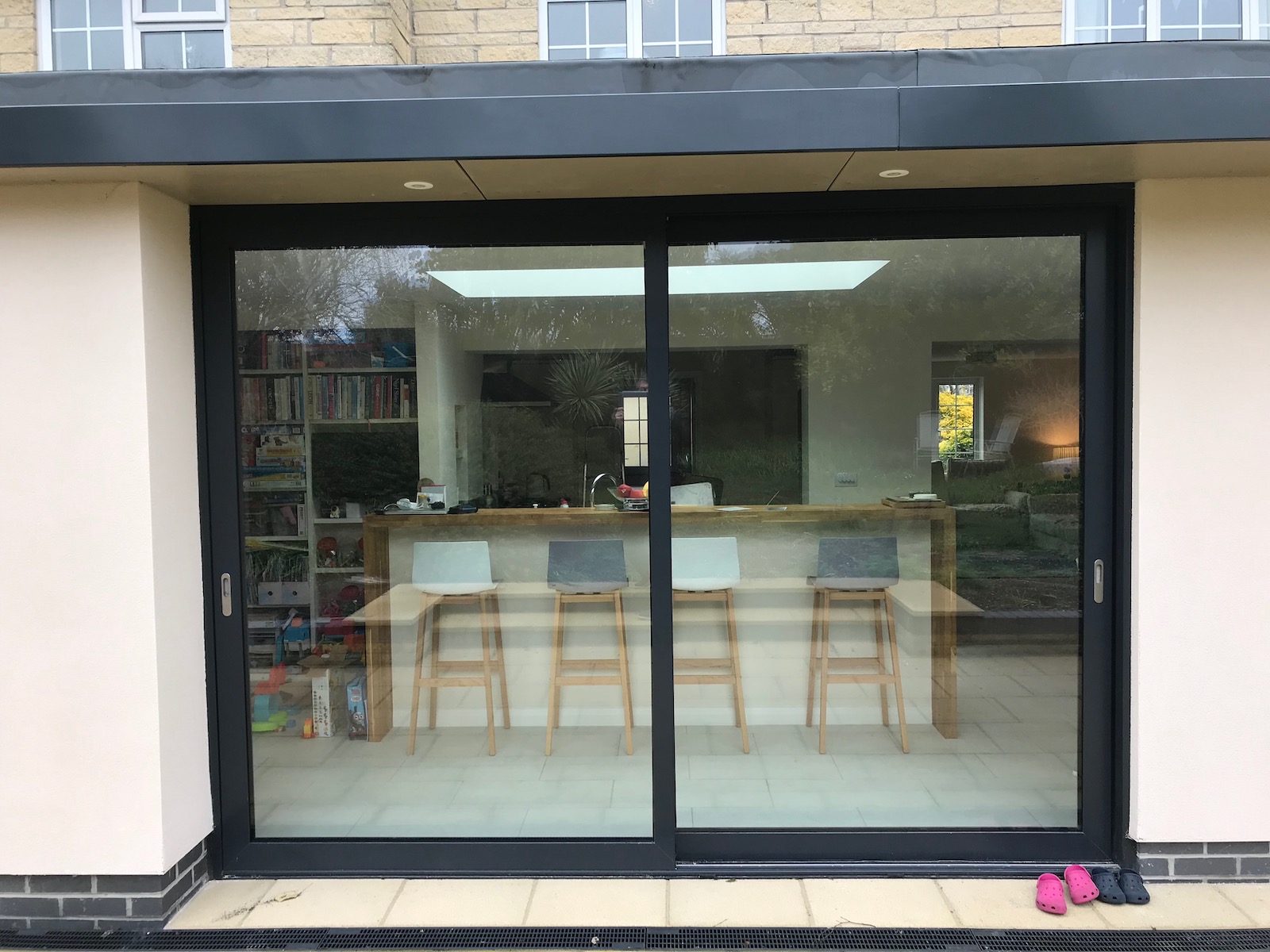 This 1970's estate home was too cramped for the growing family. After exploring several options for extending the ground floor and bedrooms, the back of the house was opened up to create a large open family room with dining area, kitchen and living room, a new cloakroom with shower and adequate coat and boot store. What a transformation!