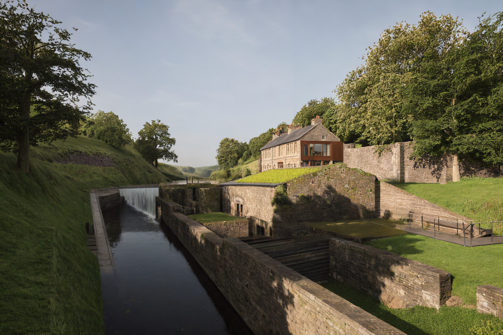Our approach fully restores the main building, while treating flanking ruins 'as found', with contemporary extensions overlooking the river and approach. The house has an upside down arrangement of open plan first floor living spaces, making the most of the daylight and views in the steep sided wooded valley.